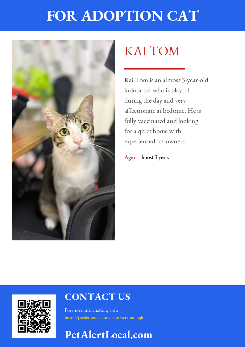 Interested in adopting Kai Tom? Let the owner know below!